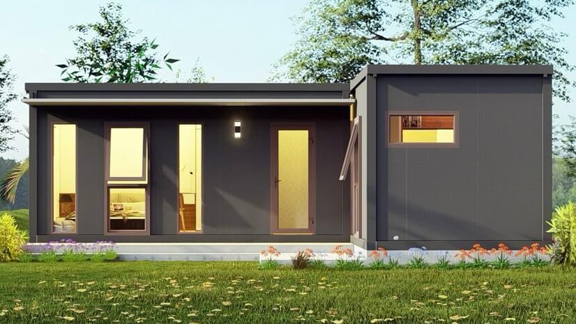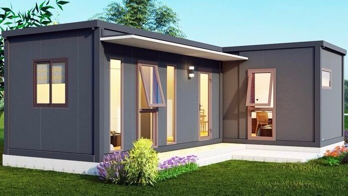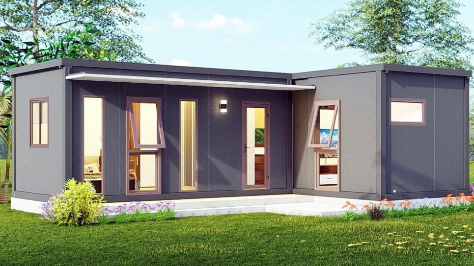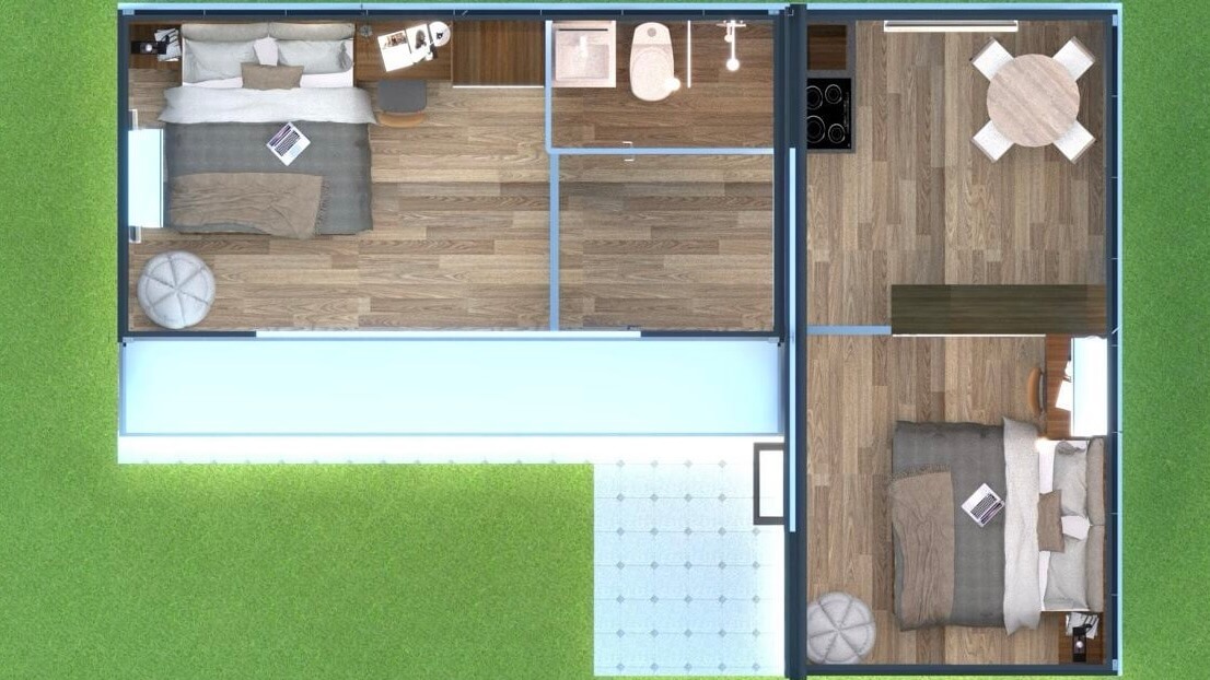 Two modular sets are seamlessly connected in a L-shaped configuration, with a shared bathroom pod.
