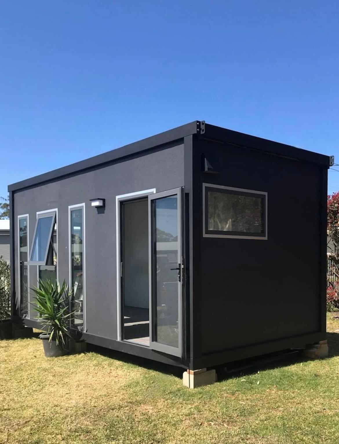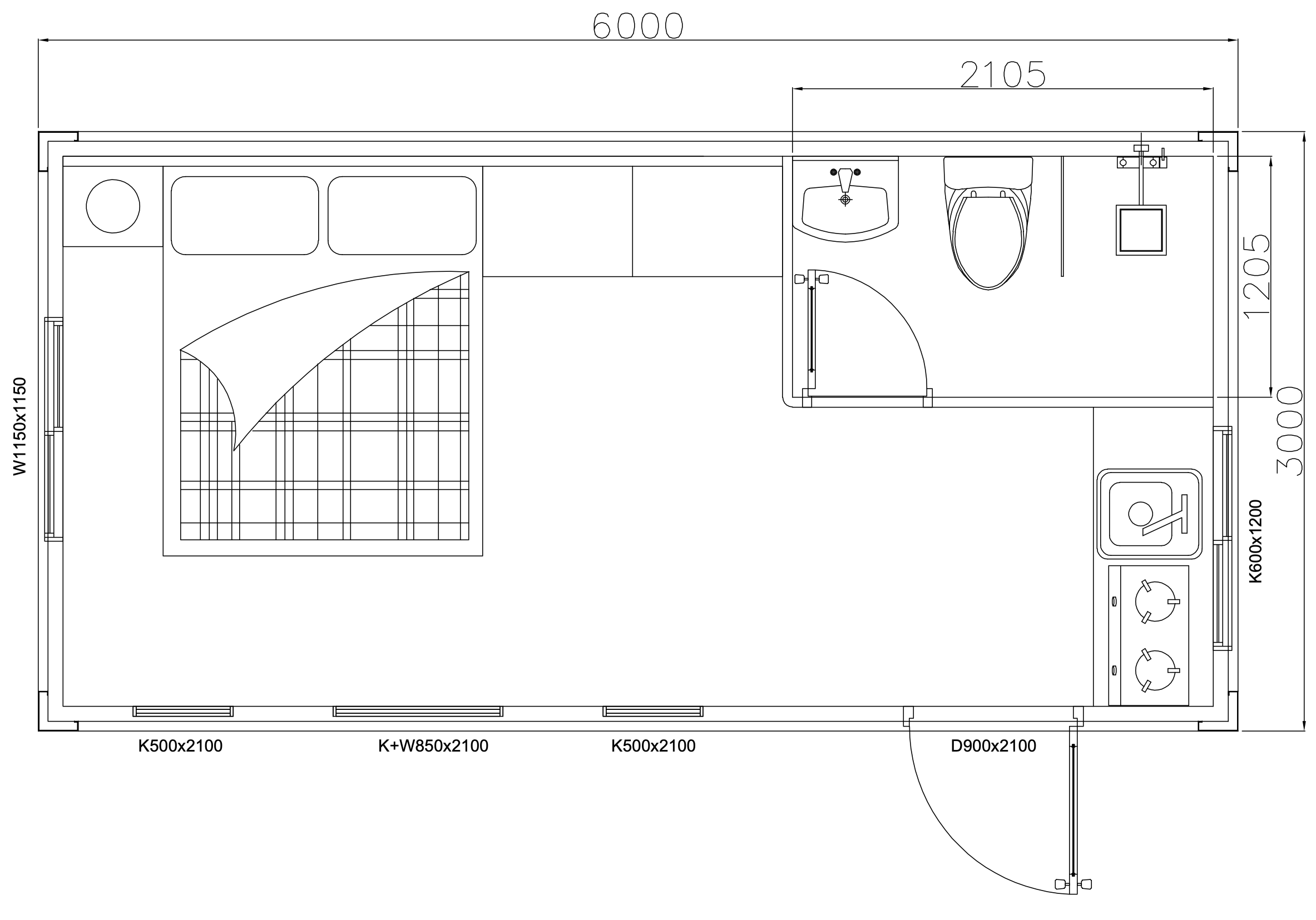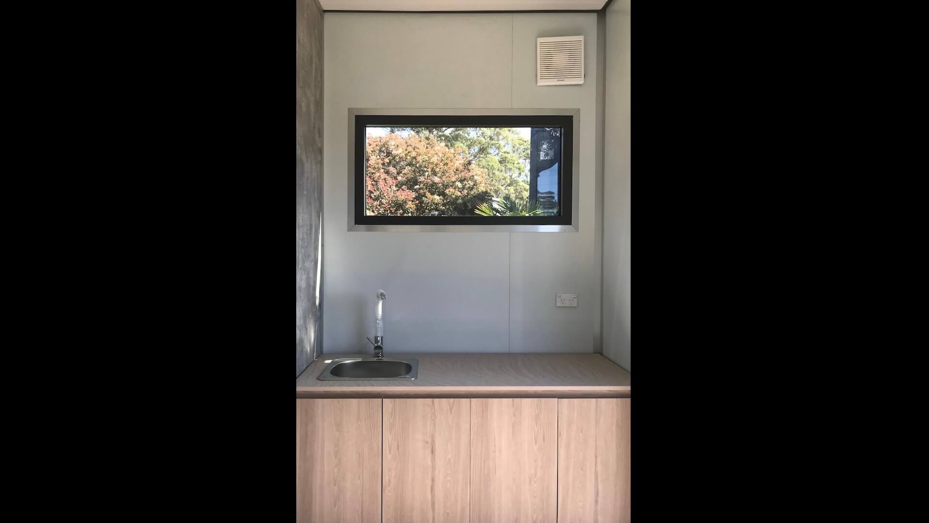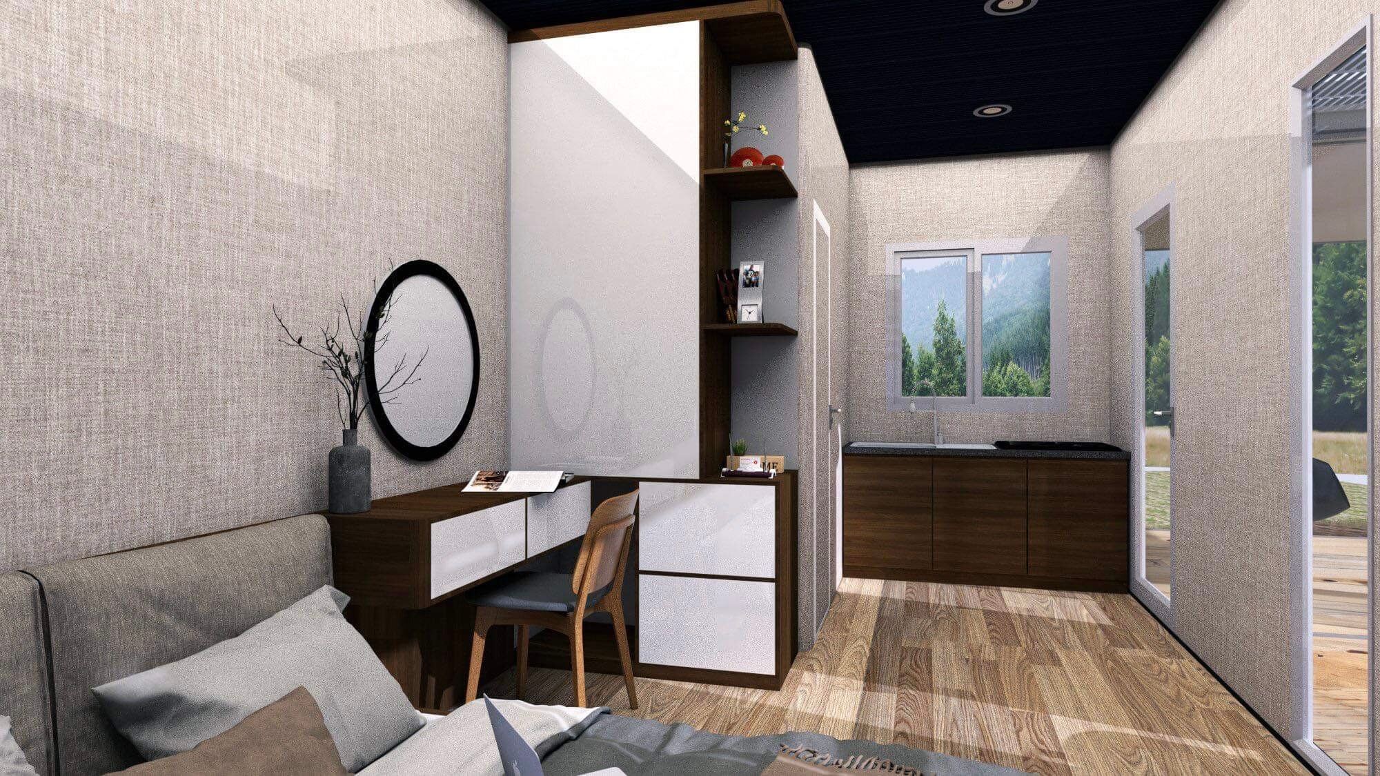 Our standard modular unit offers a stylish living space, complete with a sleek bathroom pod.